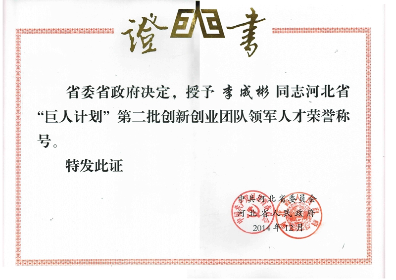 光源太陽能董事長(zhǎng)李成彬,被授予河北省“巨人計(jì)劃”第二批創(chuàng)新創(chuàng)業(yè)團(tuán)隊(duì)領(lǐng)軍人才榮譽(yù)證書