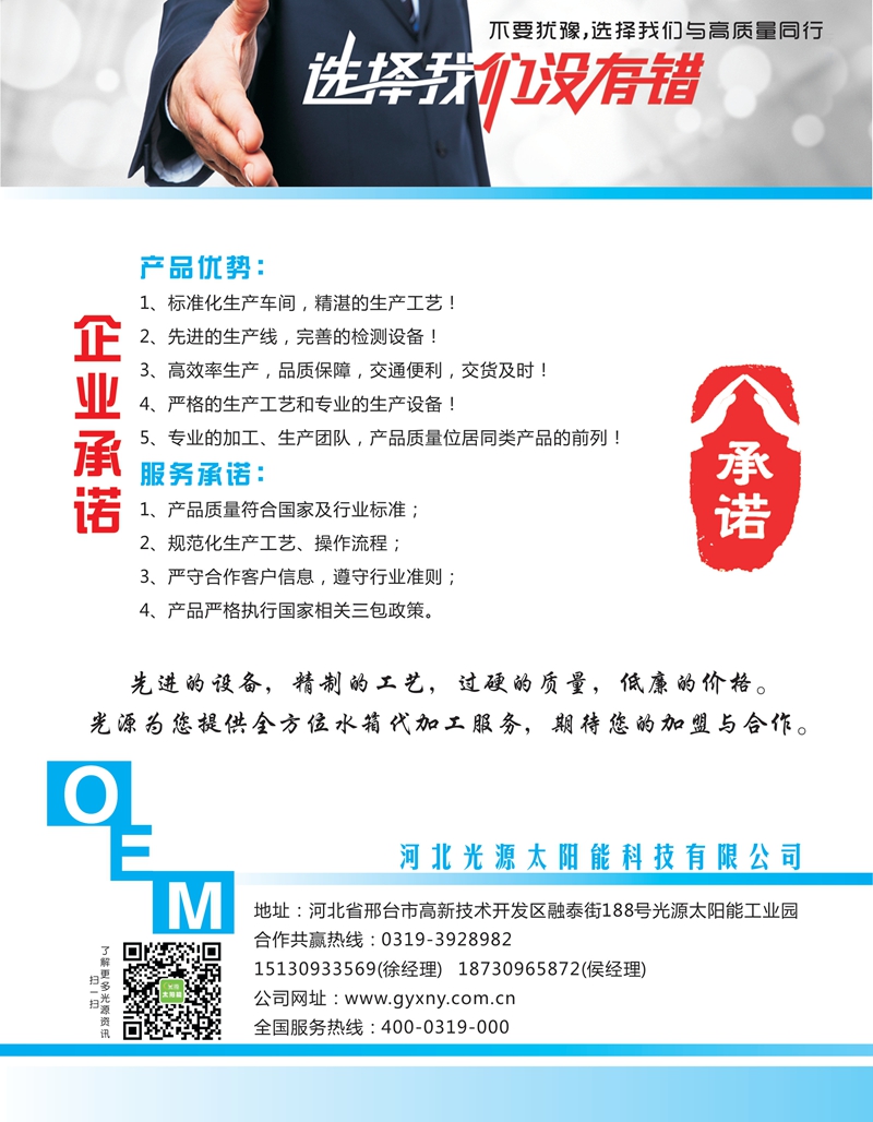 河北光源太陽能科技有限公司是一家集太陽能光熱產(chǎn)品研發(fā)、生產(chǎn)、銷售為一體的專業(yè)化骨干企業(yè)。公司地址位于河北省邢臺經(jīng)濟開發(fā)區(qū),總占地150畝,建筑面積5.2萬平方米,現(xiàn)有員工420人。主導產(chǎn)品:一是太陽能真空集熱管;二是家用型太陽能熱水器;三是集中式中高溫太陽能工程的設計、生產(chǎn)與施工。企業(yè)規(guī)模為河北省太陽能熱利用行業(yè)榜首,國內(nèi)業(yè)界名列前茅。