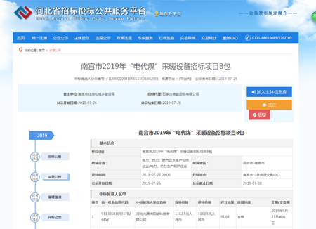 7月23日我公司(河北光源太陽能科技有限公司)在南宮市2019年“電代煤”采暖設(shè)備招標(biāo)項目的競標(biāo)中,憑借過硬的產(chǎn)品質(zhì)量,扎實高效的工作作風(fēng),卓越的運作團隊和良好的企業(yè)信譽,以絕對的優(yōu)勢順利中標(biāo)。