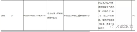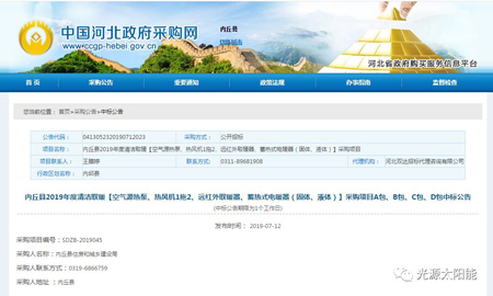 內(nèi)丘縣2019年度清潔取暖【空氣源熱泵、熱風(fēng)機(jī)1拖2、遠(yuǎn)紅外取暖器、蓄熱式電暖器(固體、液體)】采購項(xiàng)目入圍項(xiàng)目中標(biāo)公告出爐,河北光源太陽能科技有限公司憑借強(qiáng)大的品牌實(shí)力、過硬的產(chǎn)品質(zhì)量以及親民的售后服務(wù)榮登榜單。入圍產(chǎn)品為:蓄熱式電暖器(液態(tài))。