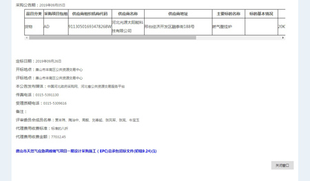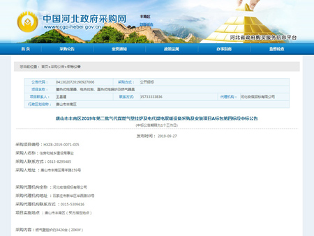 奮力拼搏創(chuàng)佳績(jī),捷報(bào)頻傳奏凱歌。河北光源太陽能科技有限公司,在2019年09月27日,唐山市豐南區(qū)2019年第二批氣代煤燃?xì)獗趻鞝t及電代煤電取暖設(shè)備采購及安裝項(xiàng)目A標(biāo)包第四標(biāo)段中標(biāo),為我公司2019年度輝煌的經(jīng)營(yíng)業(yè)績(jī)?cè)偬頋饽夭实囊还P。
