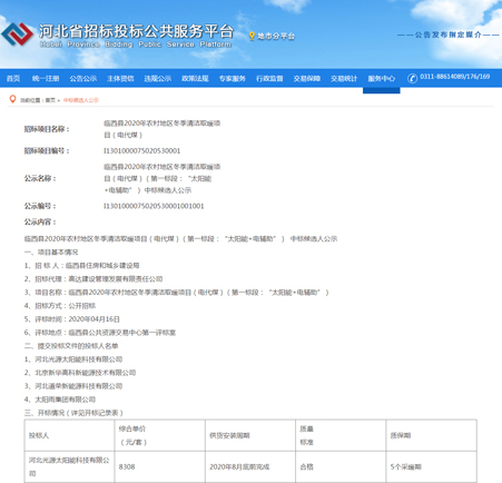 2020年,一場突如其來的疫情席卷全國,蔓延全球。隔離疫情不隔離服務,在此特殊時期,光源公司積極踐行企業(yè)社會責任,保障復工復產的同時統(tǒng)籌疫情防控,嚴防死守全面做好疫情防控工作,科學有序復工復產。全體光源人振奮精神,團結協(xié)作,高效率、高質量投入復工后的公開投標項目,憑借三十余年行業(yè)經驗和口口相傳的業(yè)界優(yōu)良口碑,以及雄厚的綜合實力,持續(xù)為客戶提供優(yōu)質的產品和專業(yè)的售后服務。河北光源太陽能科技有限公司,中標臨西縣2020年農村地區(qū)冬季清潔取暖項目(電代煤)(第一標段:“太陽能+電輔助”)。