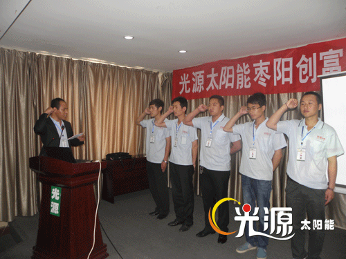 會(huì)議中湖北區(qū)域經(jīng)理劉進(jìn)輝帶領(lǐng)團(tuán)隊(duì)進(jìn)行的宣誓儀式,充分展現(xiàn)了光源太陽能有限公司的員工風(fēng)貌及企業(yè)精神。利用新能源,保護(hù)美好家園,傳承正能量,將會(huì)議推進(jìn)高潮。