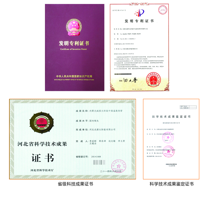 技術(shù)特點(diǎn):一是內(nèi)置CPC反射器。外罩玻璃管與吸熱管采用同軸套管,在真空管內(nèi)壁下半周設(shè)置金屬拋物面反射器,運(yùn)用拋物面原理實(shí)現(xiàn)了全角度采光,反射器不受大氣污染,聚光效果更好。二是耐高溫鍍膜技術(shù)。內(nèi)吸熱管表面濺射耐高溫太陽吸收膜層,內(nèi)外管之間抽真空,工作溫度400℃以上膜層不脫落、不老化。三是強(qiáng)制傳質(zhì)傳熱技術(shù)。在吸熱管內(nèi)插裝金屬套管,套管內(nèi)置入金屬導(dǎo)熱管,使管內(nèi)的介質(zhì)容量減少了70%,大大提高了傳質(zhì)傳熱效率。四是安全承壓技術(shù)。金屬套管與聯(lián)集箱采用絲扣連接,保證系統(tǒng)工作安全可靠。經(jīng)權(quán)威機(jī)構(gòu)檢驗(yàn),太陽能吸收比、熱損系數(shù)、真空品質(zhì)等技術(shù)指標(biāo)均優(yōu)于國(guó)家標(biāo)準(zhǔn)。采用該產(chǎn)品組成的太陽能中高溫?zé)崂孟到y(tǒng),穩(wěn)定工作溫度可達(dá)到163℃蒸汽,真正實(shí)現(xiàn)了太陽能由“熱水應(yīng)用”到“熱能應(yīng)用”的跨越式提升,填補(bǔ)了國(guó)內(nèi)太陽能中高溫真空集熱管在160℃溫區(qū)的技術(shù)空白??萍汲晒b定認(rèn)為:該產(chǎn)品的綜合性能達(dá)到了“國(guó)內(nèi)領(lǐng)先水平”,系統(tǒng)可廣泛用于太陽能飲用開水、采暖制冷、食品加工、紡織印染、農(nóng)副產(chǎn)品烘干等多種行業(yè)。對(duì)促進(jìn)大氣污染治理,推動(dòng)我國(guó)能源結(jié)構(gòu)調(diào)整具有重要意義。